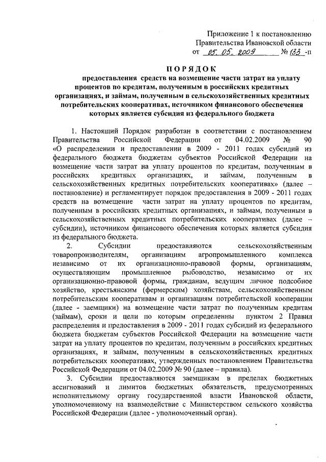 Постановление Правительства Ивановской области от 05.05.2009 N 133-п "Об утверждении порядков предоставления средств на возмещение части затрат на уплату процентов по кредитам, полученным в российских кредитных организациях, и займам, полученным в сельскохозяйственных кредитных потребительских кооперативах, а также средств на поддержку племенного животноводства и отдельных подотраслей растениеводства, источником финансового обеспечения которых является субсидия из федерального бюджета" (вместе с "Порядком предоставления сельскохозяйственным товаропроизводителям средств на поддержку племенного животноводства, источником финансового обеспечения которых является субсидия из федерального бюджета")