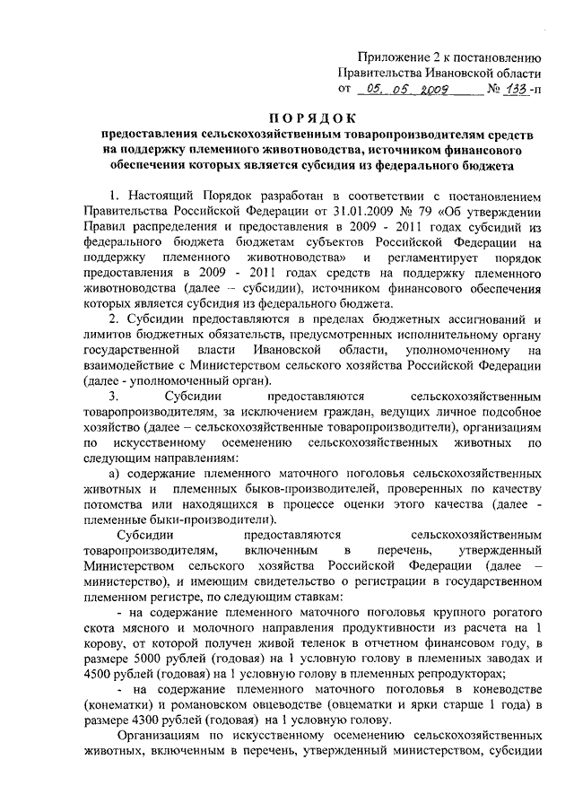 Постановление Правительства Ивановской области от 05.05.2009 N 133-п "Об утверждении порядков предоставления средств на возмещение части затрат на уплату процентов по кредитам, полученным в российских кредитных организациях, и займам, полученным в сельскохозяйственных кредитных потребительских кооперативах, а также средств на поддержку племенного животноводства и отдельных подотраслей растениеводства, источником финансового обеспечения которых является субсидия из федерального бюджета" (вместе с "Порядком предоставления сельскохозяйственным товаропроизводителям средств на поддержку племенного животноводства, источником финансового обеспечения которых является субсидия из федерального бюджета")