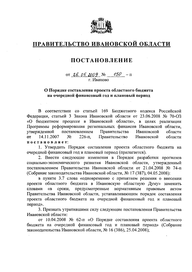Постановление Правительства Ивановской области от 26.05.2009 N 150-п "О Порядке составления проекта областного бюджета на очередной финансовый год и плановый период"