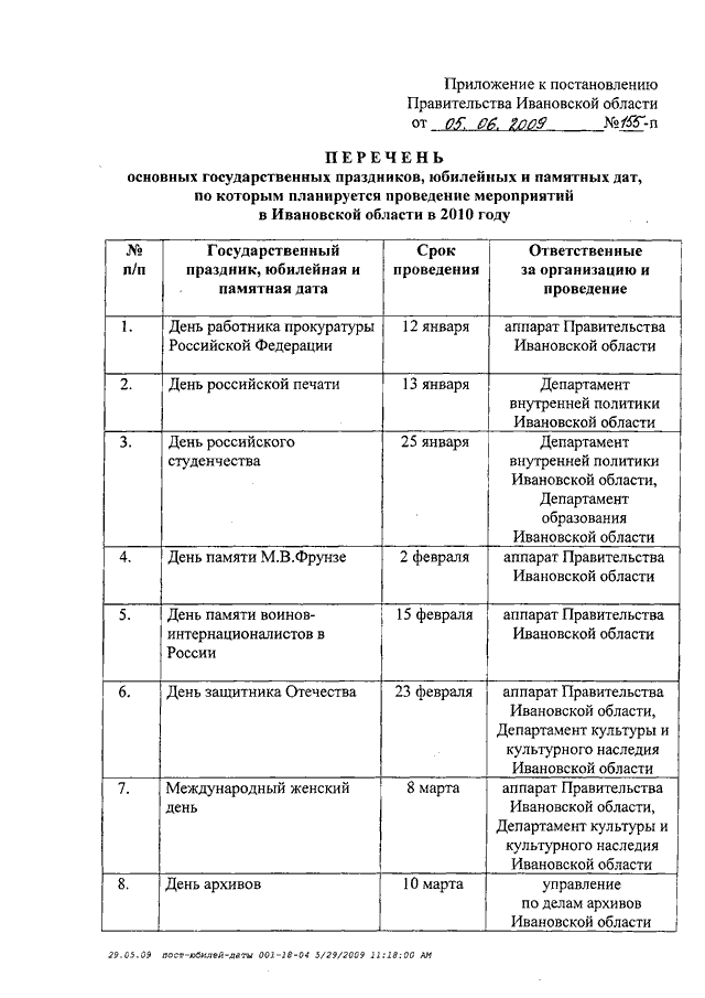 Постановление Правительства Ивановской области от 05.06.2009 N 155-п "О проведении мероприятий, связанных с государственными праздниками, юбилейными и памятными датами, в 2010 году" (вместе с "Перечнем основных государственных праздников, юбилейных и памятных дат, по которым планируется проведение мероприятий в Ивановской области в 2010 году")
