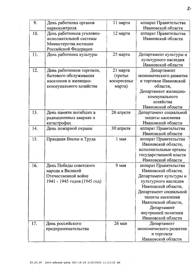 Постановление Правительства Ивановской области от 05.06.2009 N 155-п "О проведении мероприятий, связанных с государственными праздниками, юбилейными и памятными датами, в 2010 году" (вместе с "Перечнем основных государственных праздников, юбилейных и памятных дат, по которым планируется проведение мероприятий в Ивановской области в 2010 году")
