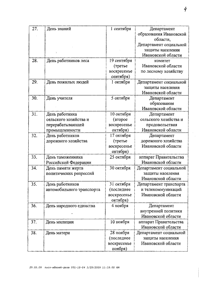 Постановление Правительства Ивановской области от 05.06.2009 N 155-п "О проведении мероприятий, связанных с государственными праздниками, юбилейными и памятными датами, в 2010 году" (вместе с "Перечнем основных государственных праздников, юбилейных и памятных дат, по которым планируется проведение мероприятий в Ивановской области в 2010 году")