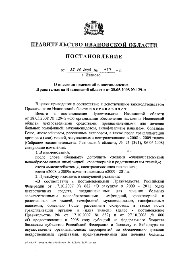 Постановление Правительства Ивановской области от 25.06.2009 N 177-п "О внесении изменений в постановление Правительства Ивановской области от 28.05.2008 N 129-п"