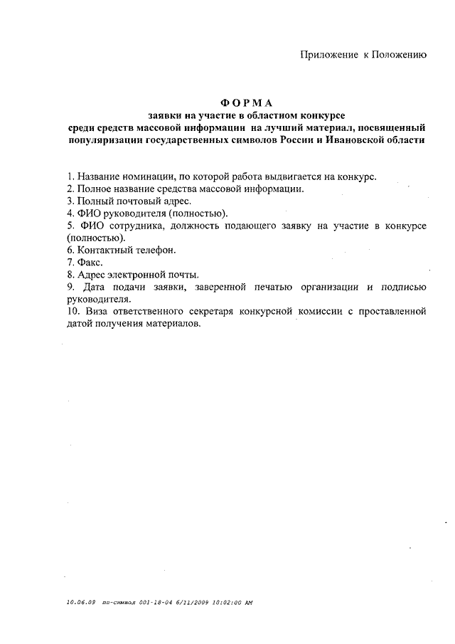 Постановление Правительства Ивановской области от 30.06.2009 N 185-п "Об областном конкурсе среди средств массовой информации на лучший материал, посвященный популяризации государственных символов России и Ивановской области" (вместе с "Положением о процедуре проведения областного конкурса среди средств массовой информации на лучший материал, посвященный популяризации государственных символов России и Ивановской области", "Положением о конкурсной комиссии областного конкурса среди средств массовой информации на лучший материал, посвященный популяризации государственных символов России и Ивановской области")
