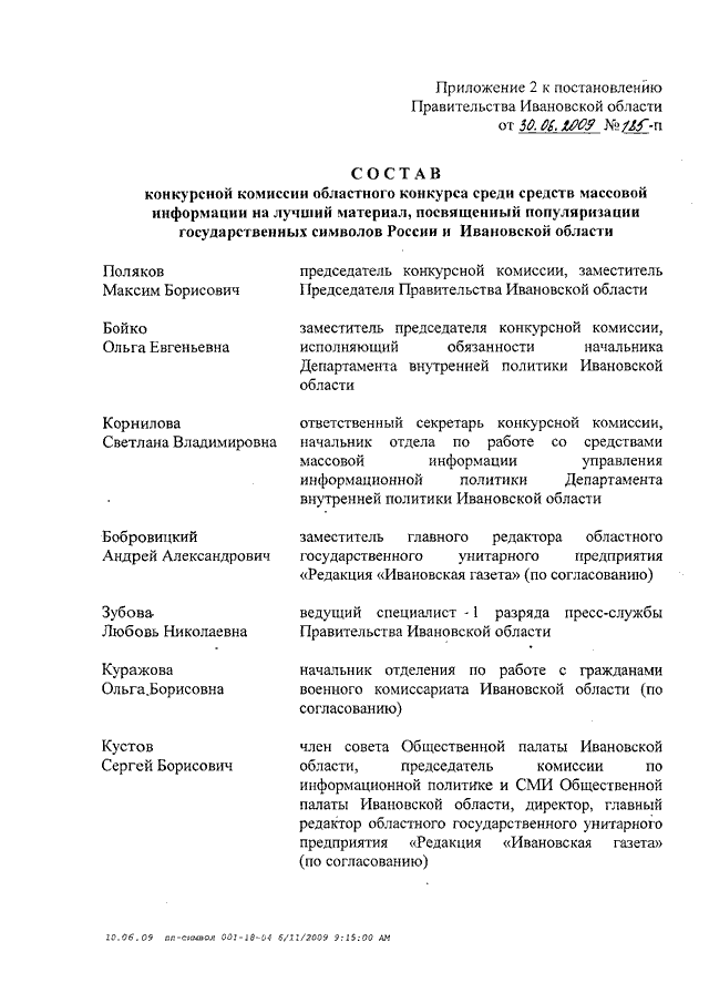 Постановление Правительства Ивановской области от 30.06.2009 N 185-п "Об областном конкурсе среди средств массовой информации на лучший материал, посвященный популяризации государственных символов России и Ивановской области" (вместе с "Положением о процедуре проведения областного конкурса среди средств массовой информации на лучший материал, посвященный популяризации государственных символов России и Ивановской области", "Положением о конкурсной комиссии областного конкурса среди средств массовой информации на лучший материал, посвященный популяризации государственных символов России и Ивановской области")