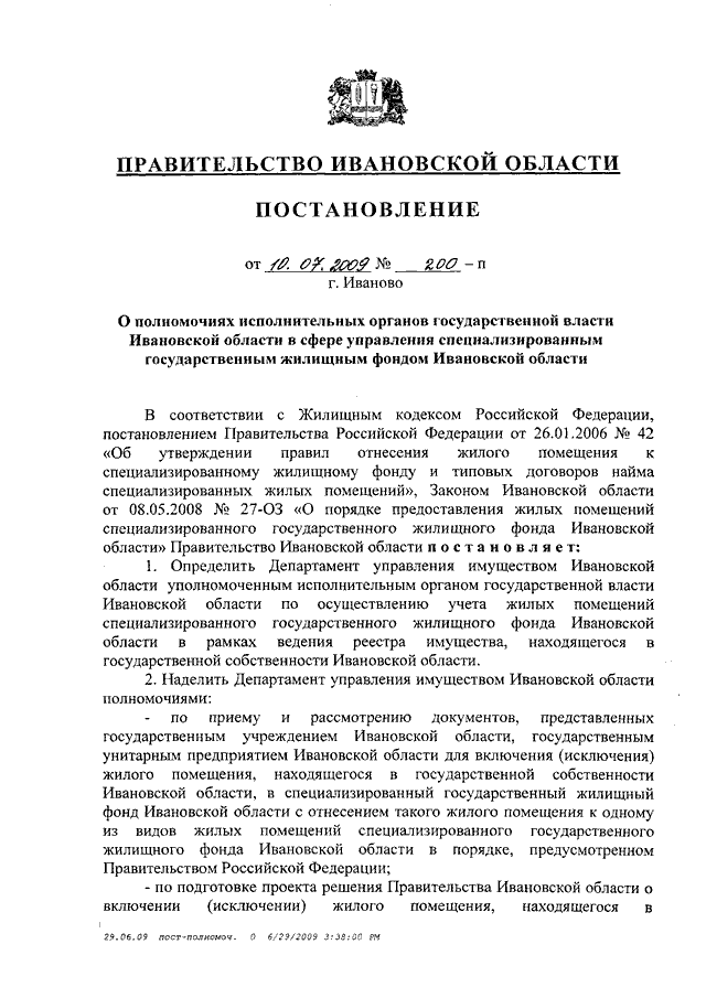 Постановление Правительства Ивановской области от 10.07.2009 N 200-п "О полномочиях исполнительных органов государственной власти Ивановской области в сфере управления специализированным государственным жилищным фондом Ивановской области"