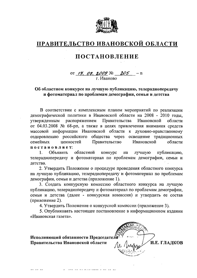 Постановление Правительства Ивановской области от 17.07.2009 N 205-п "Об областном конкурсе на лучшую публикацию, телерадиопередачу и фотоматериал по проблемам демографии, семьи и детства" (вместе с "Положением о процедуре проведения областного конкурса на лучшую публикацию, телерадиопередачу и фотоматериал по проблемам демографии, семьи и детства", "Положением о конкурсной комиссии областного конкурса на лучшую публикацию, телерадиопередачу и фотоматериал по проблемам демографии, семьи и детства")