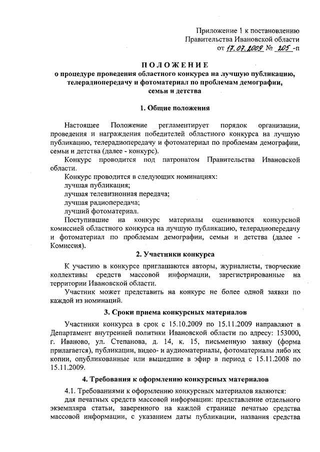 Постановление Правительства Ивановской области от 17.07.2009 N 205-п "Об областном конкурсе на лучшую публикацию, телерадиопередачу и фотоматериал по проблемам демографии, семьи и детства" (вместе с "Положением о процедуре проведения областного конкурса на лучшую публикацию, телерадиопередачу и фотоматериал по проблемам демографии, семьи и детства", "Положением о конкурсной комиссии областного конкурса на лучшую публикацию, телерадиопередачу и фотоматериал по проблемам демографии, семьи и детства")
