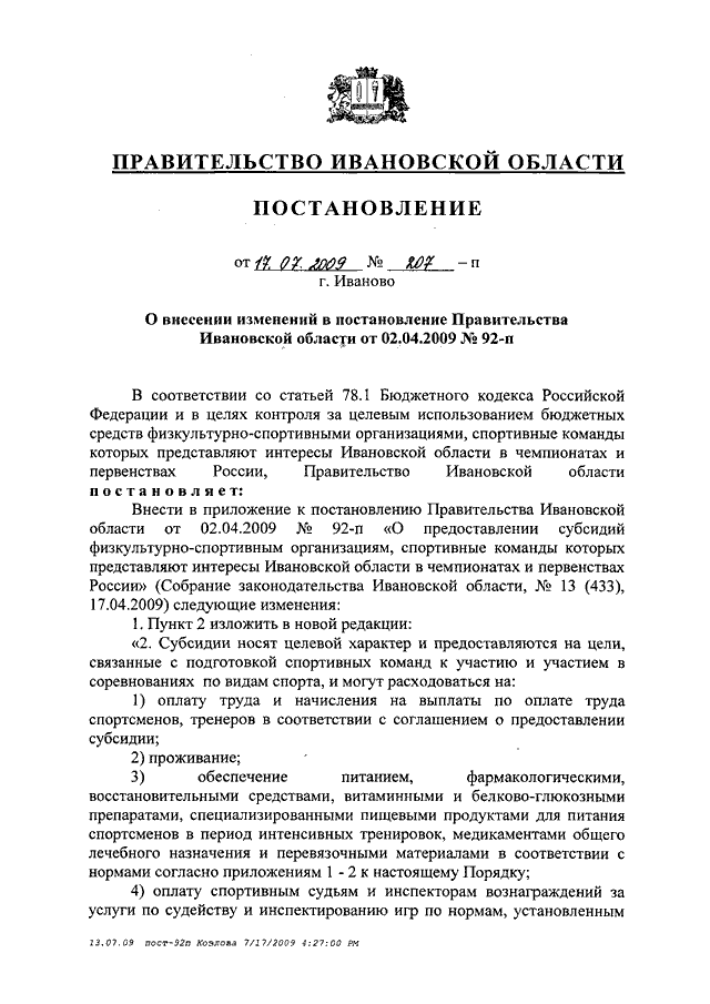 Постановление Правительства Ивановской области от 17.07.2009 N 207-п "О внесении изменений в постановление Правительства Ивановской области от 02.04.2009 N 92-п"