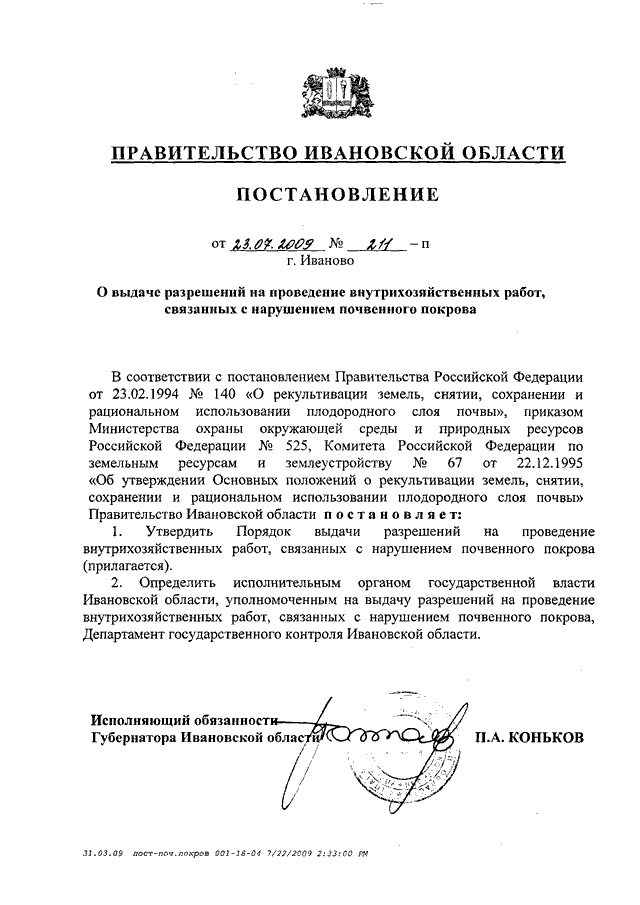 Постановление Правительства Ивановской области от 23.07.2009 N 211-п "О выдаче разрешений на проведение внутрихозяйственных работ, связанных с нарушением почвенного покрова" (вместе с "Порядком выдачи разрешений на проведение внутрихозяйственных работ, связанных с нарушением почвенного покрова")