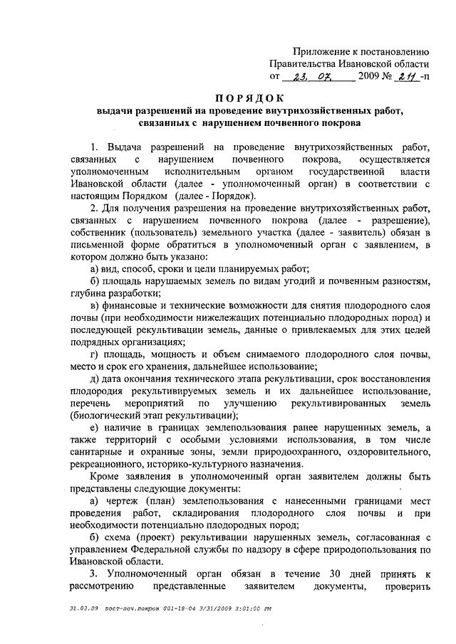Постановление Правительства Ивановской области от 23.07.2009 N 211-п "О выдаче разрешений на проведение внутрихозяйственных работ, связанных с нарушением почвенного покрова" (вместе с "Порядком выдачи разрешений на проведение внутрихозяйственных работ, связанных с нарушением почвенного покрова")