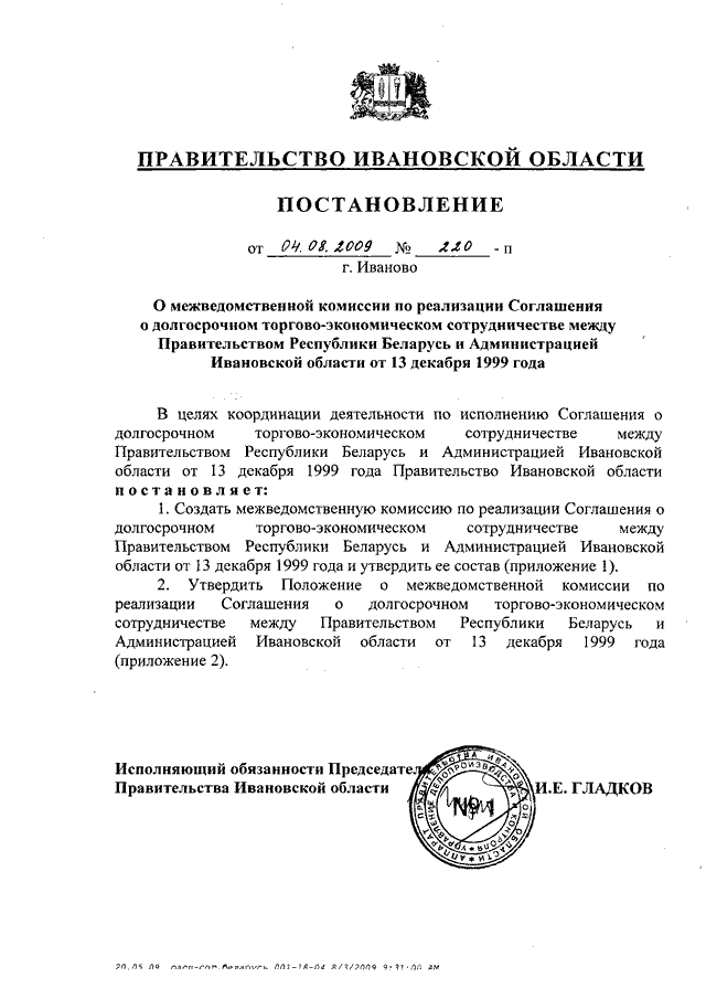 Постановление Правительства Ивановской области от 04.08.2009 N 220-п "О межведомственной комиссии по реализации Соглашения о долгосрочном торгово-экономическом сотрудничестве между Правительством Республики Беларусь и Администрацией Ивановской области от 13 декабря 1999 года" (вместе с "Положением о межведомственной комиссии по реализации Соглашения о долгосрочном торгово-экономическом сотрудничестве между Правительством Республики Беларусь и Администрацией Ивановской области от 13 декабря 1999 года")