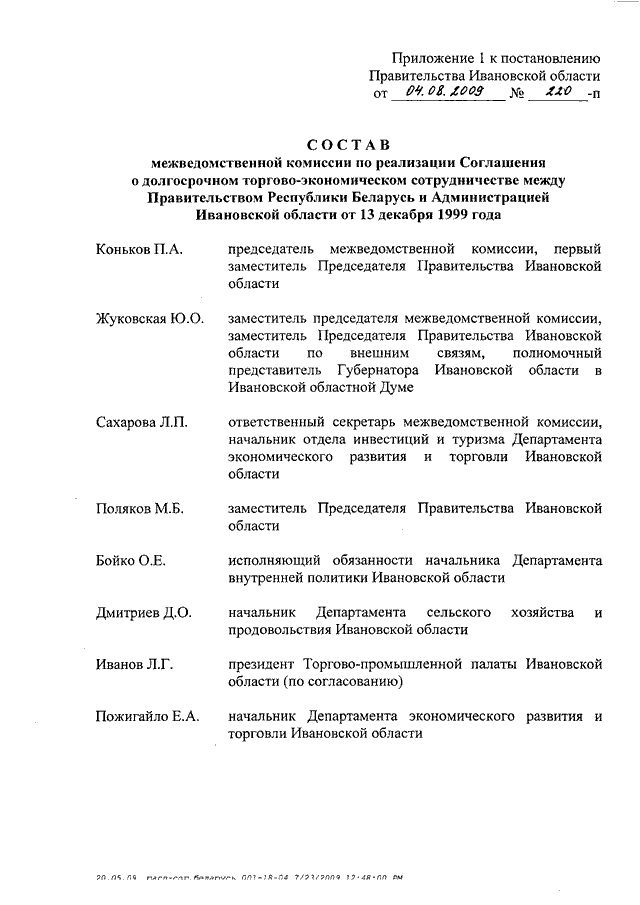 Постановление Правительства Ивановской области от 04.08.2009 N 220-п "О межведомственной комиссии по реализации Соглашения о долгосрочном торгово-экономическом сотрудничестве между Правительством Республики Беларусь и Администрацией Ивановской области от 13 декабря 1999 года" (вместе с "Положением о межведомственной комиссии по реализации Соглашения о долгосрочном торгово-экономическом сотрудничестве между Правительством Республики Беларусь и Администрацией Ивановской области от 13 декабря 1999 года")