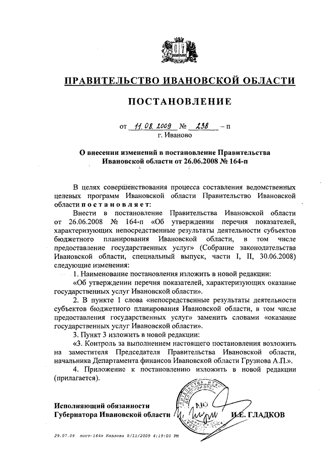 Постановление Правительства Ивановской области от 11.08.2009 N 238-п "О внесении изменений в постановление Правительства Ивановской области от 26.06.2008 N 164-п" (вместе с "Перечнем показателей, характеризующих оказание государственных услуг Ивановской области")