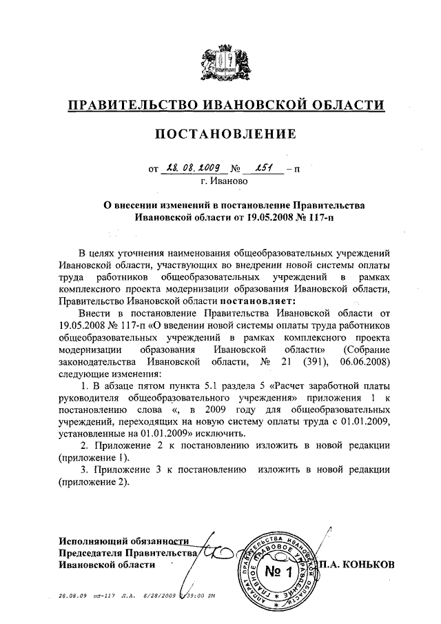 Постановление Правительства Ивановской области от 28.08.2009 N 251-п "О внесении изменений в постановление Правительства Ивановской области от 19.05.2008 N 117-п" (вместе с "Перечнем общеобразовательных учреждений Ивановской области, участвующих во внедрении новой системы оплаты труда с 01.09.2008")