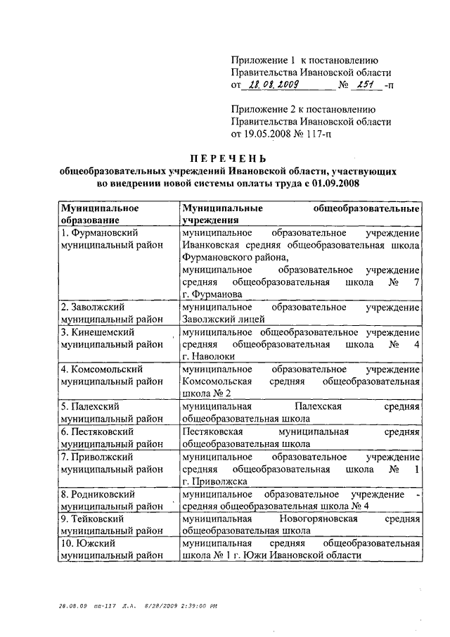 Постановление Правительства Ивановской области от 28.08.2009 N 251-п "О внесении изменений в постановление Правительства Ивановской области от 19.05.2008 N 117-п" (вместе с "Перечнем общеобразовательных учреждений Ивановской области, участвующих во внедрении новой системы оплаты труда с 01.09.2008")