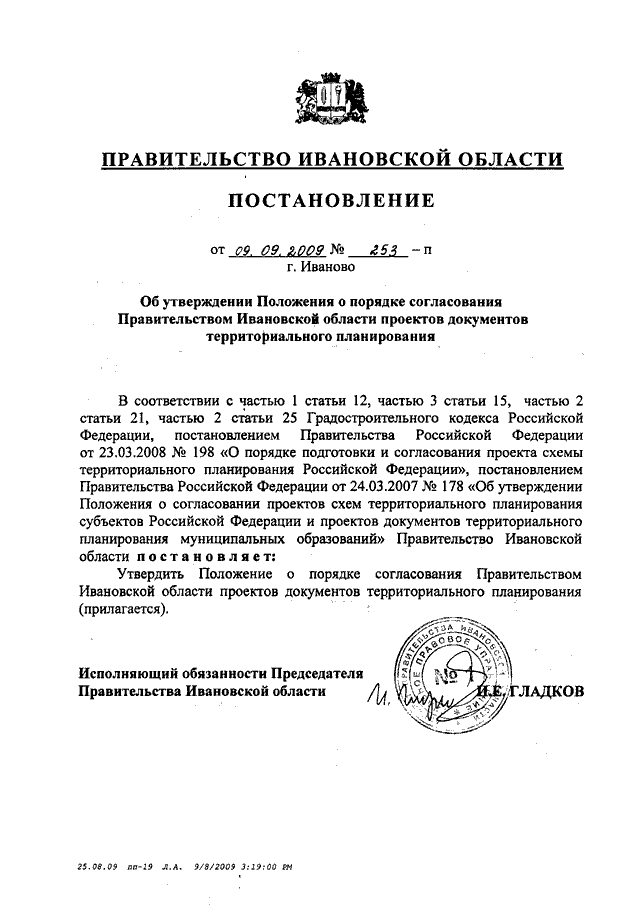 Постановление Правительства Ивановской области от 09.09.2009 N 253-п "Об утверждении Положения о порядке согласования Правительством Ивановской области проектов документов территориального планирования"
