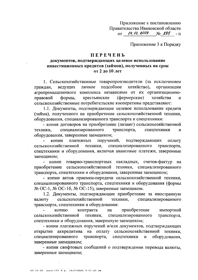 Постановление Правительства Ивановской области от 14.10.2009 N 295-п "О внесении изменений в постановления Правительства Ивановской области от 13.02.2008 N 25-п и от 05.05.2009 N 133-п" (вместе с "Перечнем документов, подтверждающих целевое использование инвестиционных кредитов (займов), полученных на срок от 2 до 10 лет")
