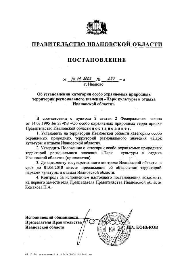 Постановление Правительства Ивановской области от 14.10.2009 N 297-п "Об установлении категории особо охраняемых природных территорий регионального значения "Парк культуры и отдыха Ивановской области" (вместе с "Положением о категории особо охраняемых природных территорий регионального значения "Парк культуры и отдыха Ивановской области")