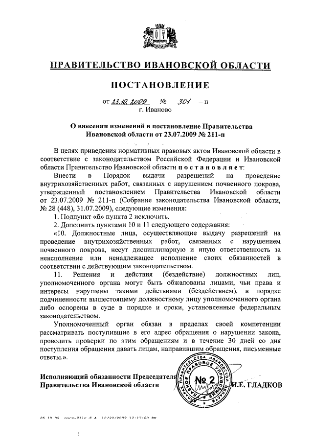 Постановление Правительства Ивановской области от 23.10.2009 N 301-п "О внесении изменений в постановление Правительства Ивановской области от 23.07.2009 N 211-п"