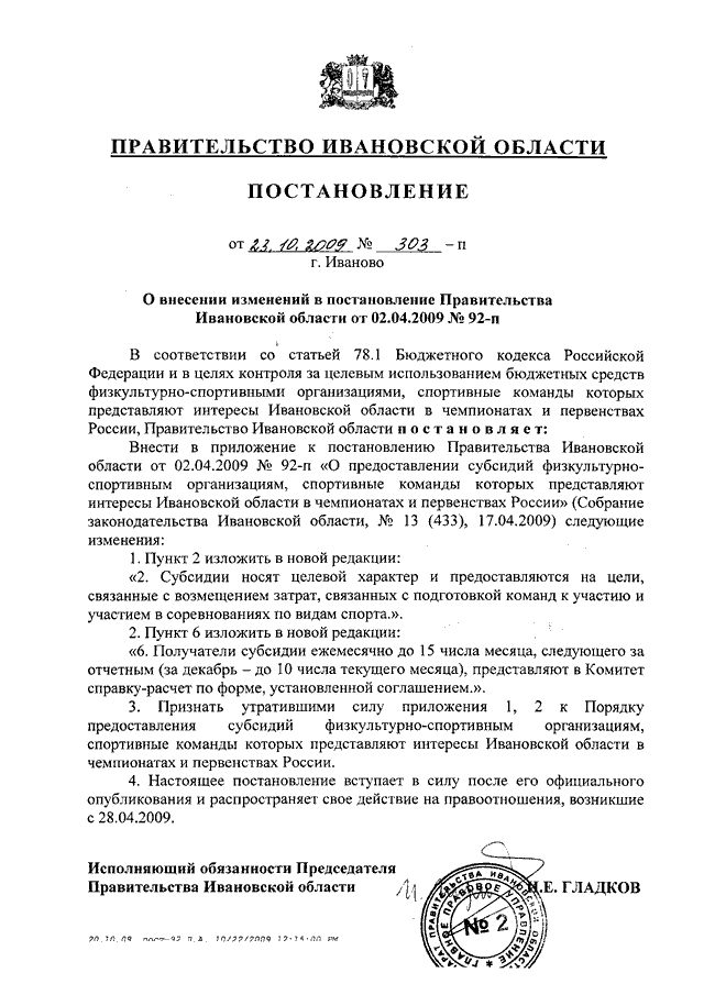 Постановление Правительства Ивановской области от 23.10.2009 N 303-п "О внесении изменений в постановление Правительства Ивановской области от 02.04.2009 N 92-п"