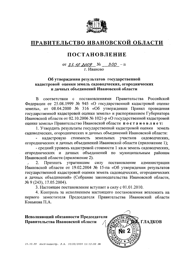Постановление Правительства Ивановской области от 23.10.2009 N 300-п "Об утверждении результатов государственной кадастровой оценки земель садоводческих, огороднических и дачных объединений Ивановской области"