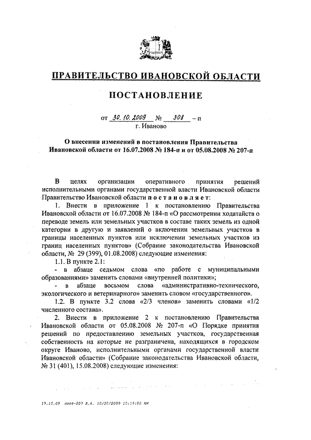 Постановление Правительства Ивановской области от 30.10.2009 N 308-п "О внесении изменений в постановления Правительства Ивановской области от 16.07.2008 N 184-п и от 05.08.2008 N 207-п"