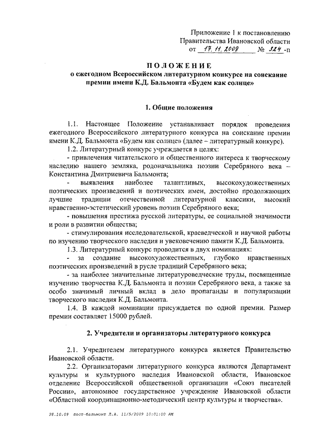 Постановление Правительства Ивановской области от 17.11.2009 N 324-п "О подготовке и проведении ежегодного Всероссийского литературного конкурса на соискание премии имени К.Д. Бальмонта "Будем как солнце" (вместе с "Положением о ежегодном Всероссийском литературном конкурсе на соискание премии имени К.Д. Бальмонта "Будем как солнце")