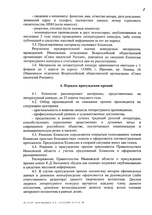 Постановление Правительства Ивановской области от 17.11.2009 N 324-п "О подготовке и проведении ежегодного Всероссийского литературного конкурса на соискание премии имени К.Д. Бальмонта "Будем как солнце" (вместе с "Положением о ежегодном Всероссийском литературном конкурсе на соискание премии имени К.Д. Бальмонта "Будем как солнце")
