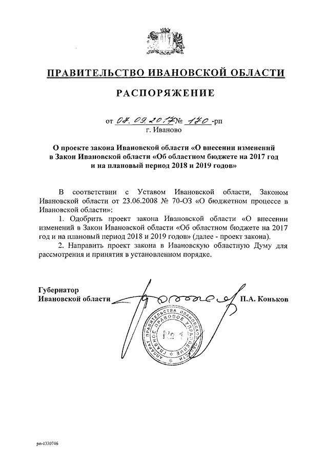 Распоряжение Правительства Ивановской области от 07.09.2017 N 170-рп "О проекте закона Ивановской области "О внесении изменений в Закон Ивановской области "Об областном бюджете на 2017 год и на плановый период 2018 и 2019 годов"