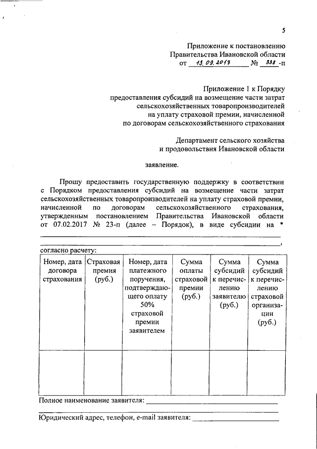 Постановление Правительства Ивановской области от 13.09.2017 N 338-п "О внесении изменений в постановление Правительства Ивановской области от 07.02.2017 N 23-п "Об утверждении Порядка предоставления субсидий на возмещение части затрат сельскохозяйственных товаропроизводителей на уплату страховой премии, начисленной по договорам сельскохозяйственного страхования"