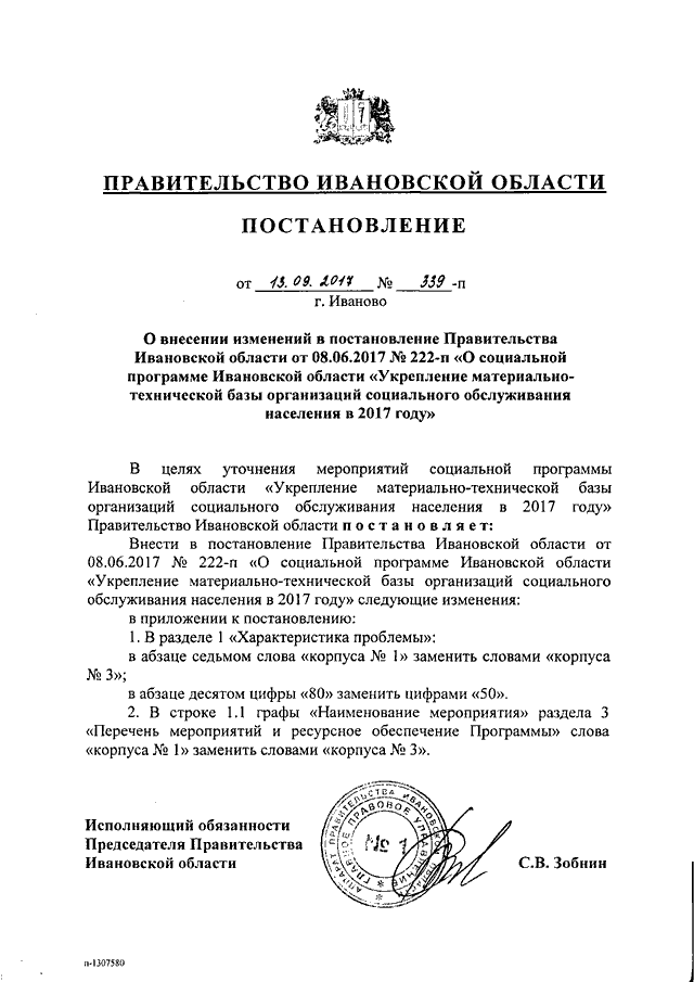 Постановление Правительства Ивановской области от 13.09.2017 N 339-п "О внесении изменений в постановление Правительства Ивановской области от 08.06.2017 N 222-п "О социальной программе Ивановской области "Укрепление материально-технической базы организаций социального обслуживания населения в 2017 году"