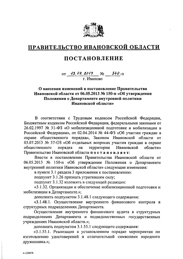 Постановление Правительства Ивановской области от 13.09.2017 N 340-п "О внесении изменений в постановление Правительства Ивановской области от 06.05.2013 N 150-п "Об утверждении Положения о Департаменте внутренней политики Ивановской области"
