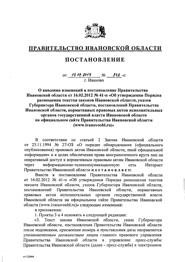 Постановление Правительства Ивановской области от 13.09.2017 N 342-п "О внесении изменений в постановление Правительства Ивановской области от 16.02.2012 N 41-п "Об утверждении Порядка размещения текстов законов Ивановской области, указов Губернатора Ивановской области, постановлений Правительства Ивановской области, нормативных правовых актов исполнительных органов государственной власти Ивановской области на официальном сайте Правительства Ивановской области (www.ivanovoobl.ru)"