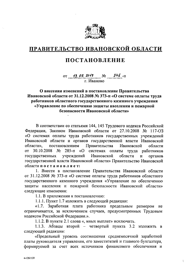 Постановление Правительства Ивановской области от 13.09.2017 N 346-п "О внесении изменений в постановление Правительства Ивановской области от 31.12.2008 N 373-п "О системе оплаты труда работников областного государственного казенного учреждения "Управление по обеспечению защиты населения и пожарной безопасности Ивановской области"