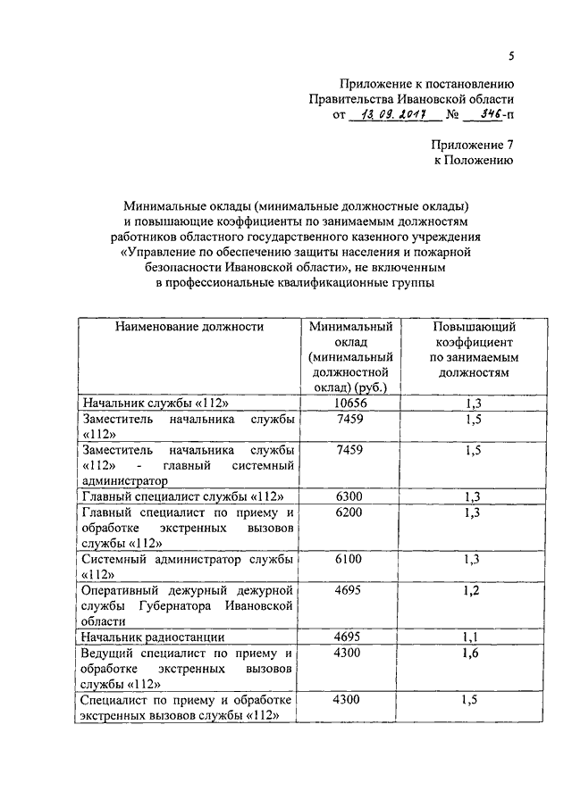 Постановление Правительства Ивановской области от 13.09.2017 N 346-п "О внесении изменений в постановление Правительства Ивановской области от 31.12.2008 N 373-п "О системе оплаты труда работников областного государственного казенного учреждения "Управление по обеспечению защиты населения и пожарной безопасности Ивановской области"