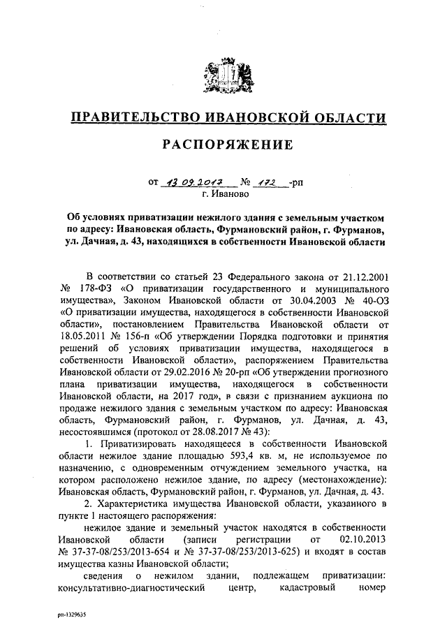 Распоряжение Правительства Ивановской области от 13.09.2017 N 172-рп "Об условиях приватизации нежилого здания с земельным участком по адресу: Ивановская область, Фурмановский район, г. Фурманов, ул. Дачная, д. 43, находящихся в собственности Ивановской области"