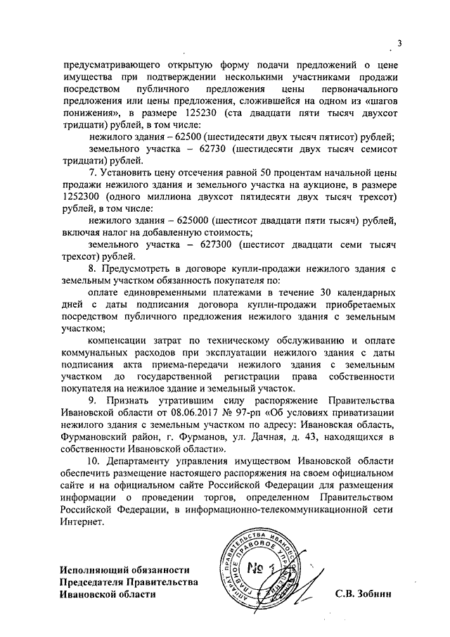 Распоряжение Правительства Ивановской области от 13.09.2017 N 172-рп "Об условиях приватизации нежилого здания с земельным участком по адресу: Ивановская область, Фурмановский район, г. Фурманов, ул. Дачная, д. 43, находящихся в собственности Ивановской области"
