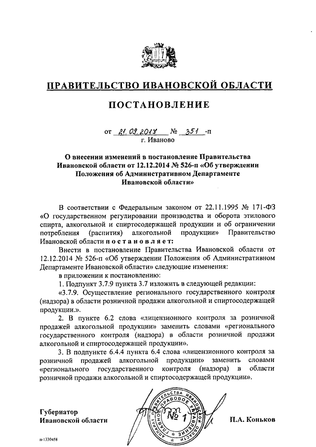 Постановление Правительства Ивановской области от 21.09.2017 N 351-п "О внесении изменений в постановление Правительства Ивановской области от 12.12.2014 N 526-п "Об утверждении Положения об Административном Департаменте Ивановской области"