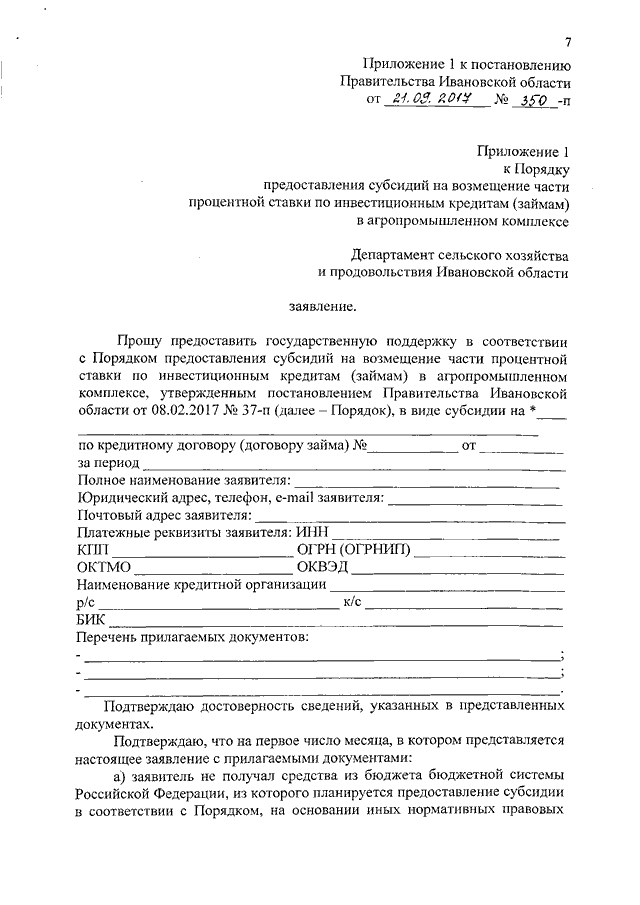 Постановление Правительства Ивановской области от 21.09.2017 N 350-п "О внесении изменений в постановление Правительства Ивановской области от 08.02.2017 N 37-п "Об утверждении Порядка предоставления субсидий на возмещение части процентной ставки по инвестиционным кредитам (займам) в агропромышленном комплексе" (вместе с "Перечнем документов, подтверждающих целевое использование инвестиционных кредитов (займов), полученных на срок от 2 до 15 лет")