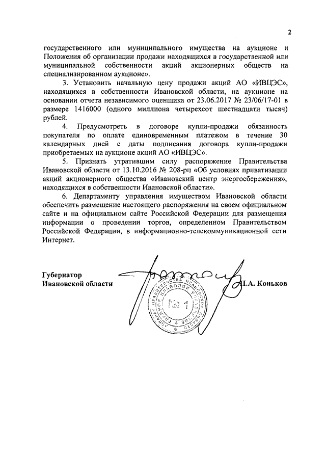 Распоряжение Правительства Ивановской области от 21.09.2017 N 174-рп "Об условиях приватизации акций акционерного общества "Ивановский центр энергосбережения", находящихся в собственности Ивановской области"