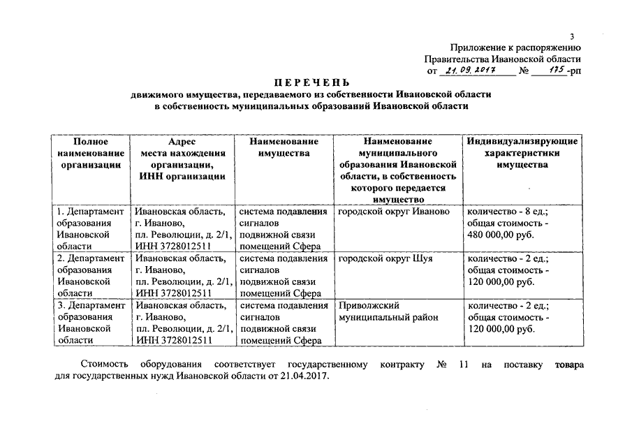 Распоряжение Правительства Ивановской области от 21.09.2017 N 175-рп "О передаче движимого имущества из собственности Ивановской области в собственность муниципальных образований Ивановской области"