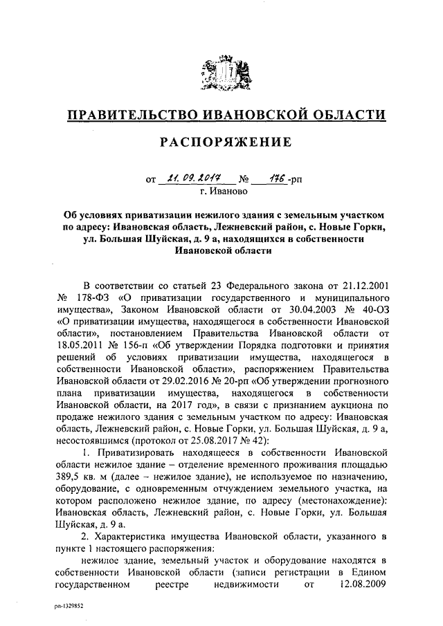 Распоряжение Правительства Ивановской области от 21.09.2017 N 176-рп "Об условиях приватизации нежилого здания с земельным участком по адресу: Ивановская область, Лежневский район, с. Новые Горки, ул. Большая Шуйская, д. 9а, находящихся в собственности Ивановской области"