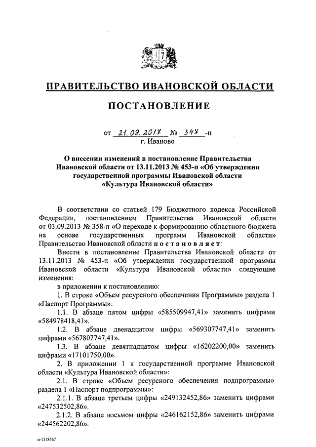 Постановление Правительства Ивановской области от 21.09.2017 N 347-п "О внесении изменений в постановление Правительства Ивановской области от 13.11.2013 N 453-п "Об утверждении государственной программы Ивановской области "Культура Ивановской области"