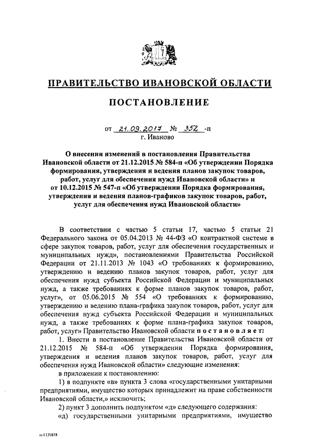 Постановление Правительства Ивановской области от 21.09.2017 N 352-п "О внесении изменений в постановления Правительства Ивановской области от 21.12.2015 N 584-п "Об утверждении Порядка формирования, утверждения и ведения планов закупок товаров, работ, услуг для обеспечения нужд Ивановской области" и от 10.12.2015 N 547-п "Об утверждении Порядка формирования, утверждения и ведения планов-графиков закупок товаров, работ, услуг для обеспечения нужд Ивановской области"