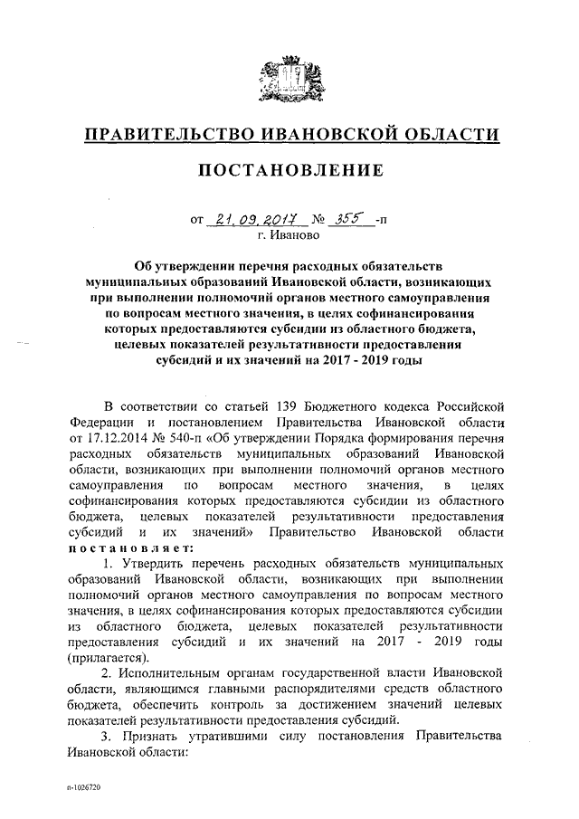 Постановление Правительства Ивановской области от 21.09.2017 N 355-п "Об утверждении перечня расходных обязательств муниципальных образований Ивановской области, возникающих при выполнении полномочий органов местного самоуправления по вопросам местного значения, в целях софинансирования которых предоставляются субсидии из областного бюджета, целевых показателей результативности предоставления субсидий и их значений на 2017 - 2019 годы"