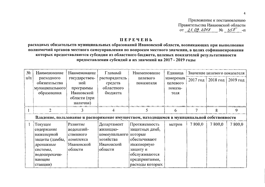 Постановление Правительства Ивановской области от 21.09.2017 N 355-п "Об утверждении перечня расходных обязательств муниципальных образований Ивановской области, возникающих при выполнении полномочий органов местного самоуправления по вопросам местного значения, в целях софинансирования которых предоставляются субсидии из областного бюджета, целевых показателей результативности предоставления субсидий и их значений на 2017 - 2019 годы"