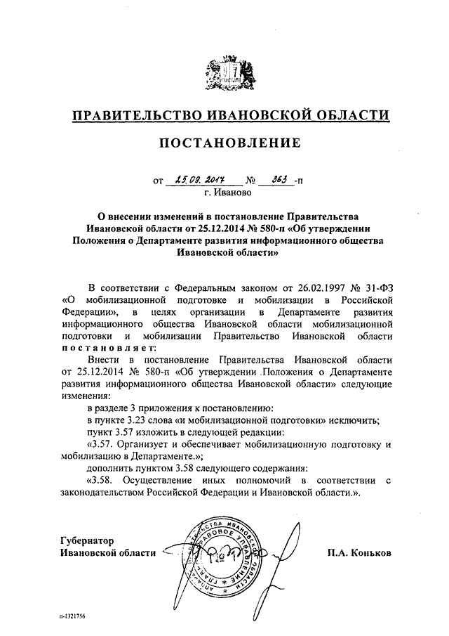 Постановление Правительства Ивановской области от 25.09.2017 N 363-п "О внесении изменений в постановление Правительства Ивановской области от 25.12.2014 N 580-п "Об утверждении Положения о Департаменте развития информационного общества Ивановской области"
