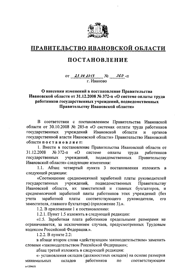 Постановление Правительства Ивановской области от 25.09.2017 N 360-п "О внесении изменений в постановление Правительства Ивановской области от 31.12.2008 N 372-п "О системе оплаты труда работников государственных учреждений, подведомственных Правительству Ивановской области"