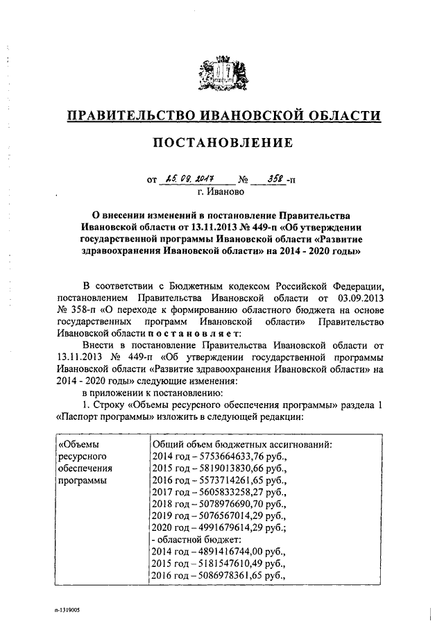 Постановление Правительства Ивановской области от 25.09.2017 N 358-п "О внесении изменений в постановление Правительства Ивановской области от 13.11.2013 N 449-п "Об утверждении государственной программы Ивановской области "Развитие здравоохранения Ивановской области" на 2014 - 2020 годы"